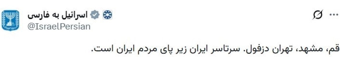 İsrail Dışişleri Bakanlığı’na ilişkin “IsraelPersian” isimli X hesabından yapılan Farsça paylaşımda, şovların sürdüğü kentlere atıfta bulunularak, “Kum, Meşhed, Tahran, Dezfulİran’ın tamamı İran halkınındır” sözleri kullanıldı.